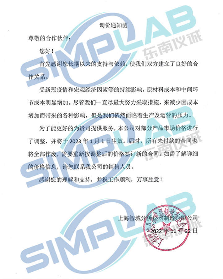 受疫情和宏觀經(jīng)濟因素的持續(xù)影響,原材料和中間環(huán)節(jié)成本明顯增加,上海智城將對部分產(chǎn)品價格進行調(diào)整,新價格將于2023年1月1日生效。